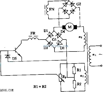 直流電動機曲轉(zhuǎn)速控制電路圖可用于控制小功率直流電動機、串勵電動機或并勵電動機的轉(zhuǎn)速和轉(zhuǎn)向。電動機與整流橋G1串聯(lián),然后接在電網(wǎng)變壓器次級繞組n2上。如果整流橋輸出端不通,則電動機停止,這相當于電位器Rp滑動觸點在中間位置上的情況,如果滑動觸點向上或向下運動,則電機將正轉(zhuǎn)或反轉(zhuǎn),故可控制電動機運轉(zhuǎn)。