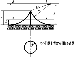 二、當h大于hr時,在避雷針上取高度hr的一點代替單支避雷針的針尖作為圓心。其余做法同本款第1)項。1-8和1-9式中的h用hr代入。