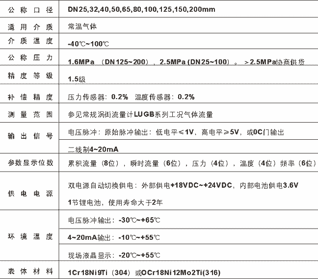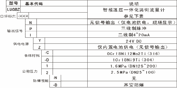 概述 LUGBZ系列智能溫壓一體化渦街流量計集流量、溫度壓力傳感器于一體,除了保留LUGB系列的所有特點外,采用現代微處理技術,并通過現場的液晶顯示器,無需與流量積算儀配合即可實現對氣體的標準狀態(tài)流量或質量流量的計量。 技術參數 型號選擇及說明 口徑標志表