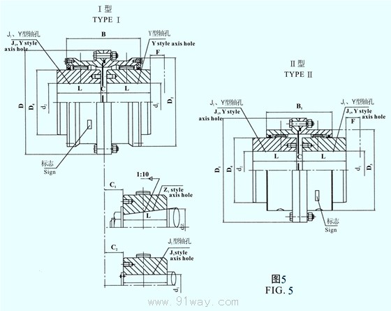 Ⅰ型與Ⅱ型聯(lián)軸器基本參數(shù)和主要尺寸應(yīng)符合圖5及表5的規(guī)定。