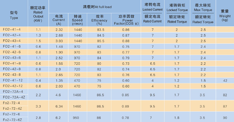 FO2系列三相異步電動機主要技術數據(380V、50Hz)