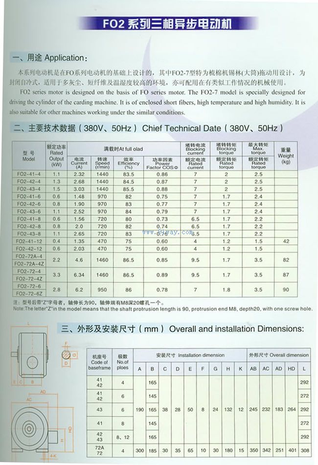 FO2系列三相異步電動機是在FO系列電動機的基礎上設計的,其中FO2-7特為梳棉機錫林(大滾筒)拖動用設計,為封閉自冷式,適用于多灰塵、短纖維及溫度較高的環境,亦可配用在有類似工作情況的機械使用。