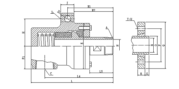 外管可直接連接到輥筒上隨其同步運轉,為主要的旋轉部件。經過精加工的外管球面、底蓋和密封環共同組成動密封摩擦副,密封環浮動在外管球面和底蓋之間,但并不與殼體接觸。無油軸承在殼體和外管間起支撐和導向作用。當密封環磨損時,借助彈簧和介質壓力殼體將向遠離軸頭方向緩慢移動以補償密封環的正常磨損。因此,旋轉接頭和管路連接必須使用金屬軟管,這樣旋轉接頭才能自由地向遠離軸頭方向緩慢移動,旋轉接頭才可保持密封。