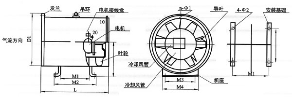 安裝方便、占地較離心風機少:該風機基本形式為軸流風機,可直接與風管和墻壁安裝,(安裝形式可垂直式、水平是或吊裝式),很大程度的節省了占地面機。同時,不受機號較大和所需大風之影響,采用電機直聯防時,使其運行可靠。
