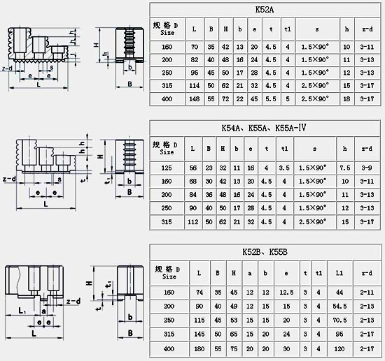 A型:卡盤配帶梳齒型硬卡爪B型:卡盤配帶十字鍵型軟卡爪C型:卡盤配帶梳齒型軟卡爪A-C型:卡盤配帶梳齒型軟卡爪和硬卡爪各一副