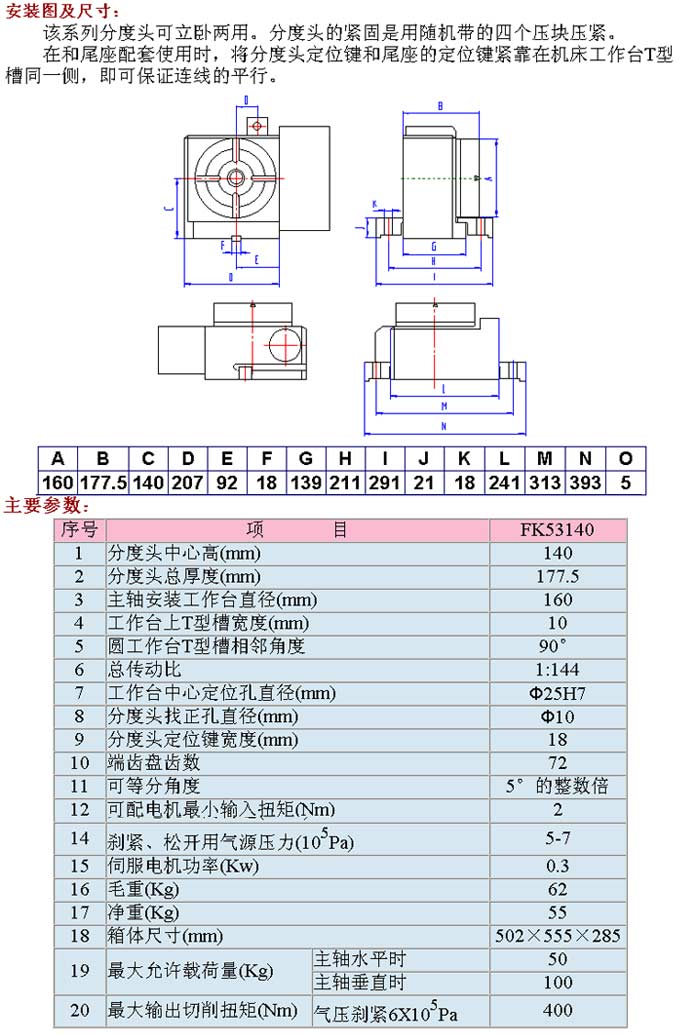 FK53140數控等分分度頭是以端齒盤定位鎖緊,以壓縮空氣推動齒盤,實現工作臺的松開、剎緊,以伺服電機驅動工作臺旋轉的具有間斷分度功能的機床附件。該產品專門和加工中心及數控鏜銑床配套使用,作為機床第四回轉軸,實現機床對分度類零部件進行精密加工。工作臺可立臥兩用,完成5° 的整數倍的分度工作,和尾座配套安裝時,可完成對長軸類零件的分度加工。