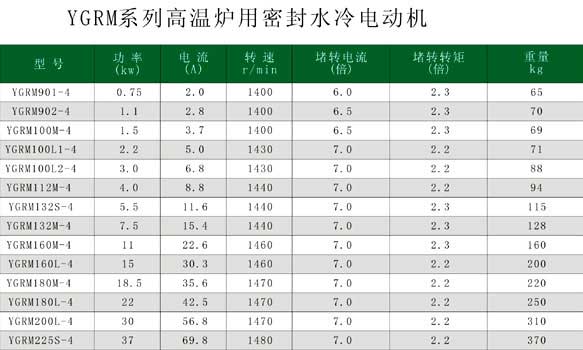 YGRM高溫爐用密封水冷電動(dòng)機(jī)技術(shù)參數(shù):