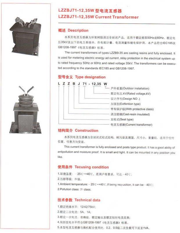 LZZBJ71-12 高壓澆注式電流互感器技術參數,型號說明書