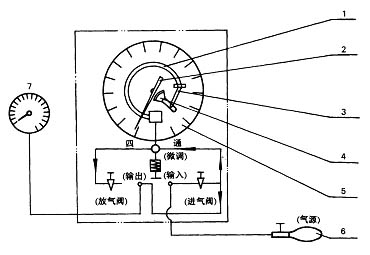 儀表由外接氣源(或醫(yī)用加壓球)供壓,通過輸入接咀,進(jìn)氣閥把空氣壓力同時(shí)輸入被檢儀表和本儀表的彈性元件內(nèi),彈性元件在空氣壓力作用下,其自由端產(chǎn)生位移,此位移通過連桿及齒輪傳動(dòng)機(jī)構(gòu)進(jìn)行放大,由指針將被測(cè)壓力在表盤上指示出來,并對(duì)被檢儀表的指示值進(jìn)行檢驗(yàn)。