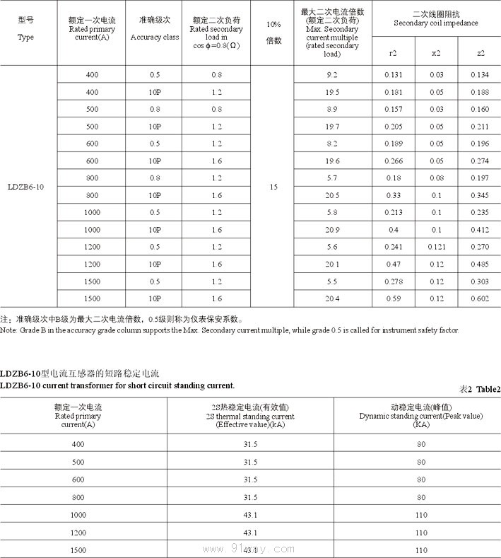 LDZB6-10型電流互感器技術參數 LDZB6-10型電流互感器的額定二次負荷、10%倍數、最大二次電流倍數及二次線圈阻抗