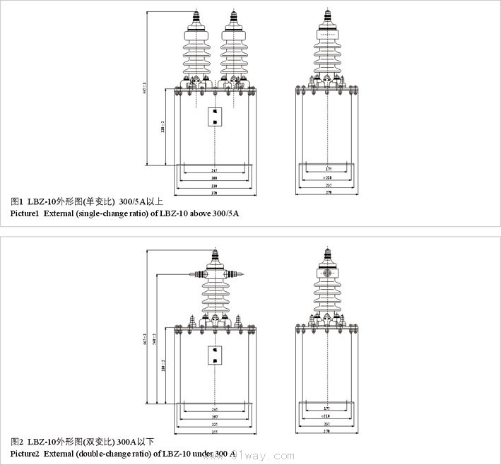 LBZ(W)-10型戶外干式電流互感器為單變比和雙變比,雙變比在一次進(jìn)行換接,以滿足電網(wǎng)不同容量的需求。