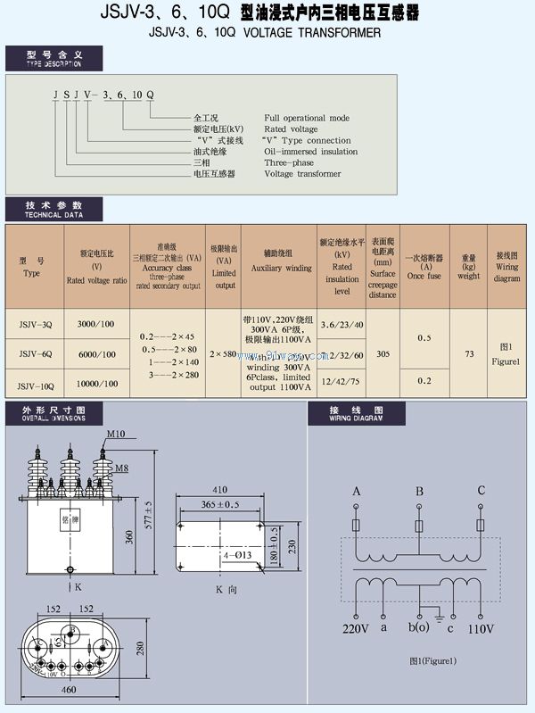 4、JSJV-3(W)系列油浸式三相電壓互感器技術參數見下表: