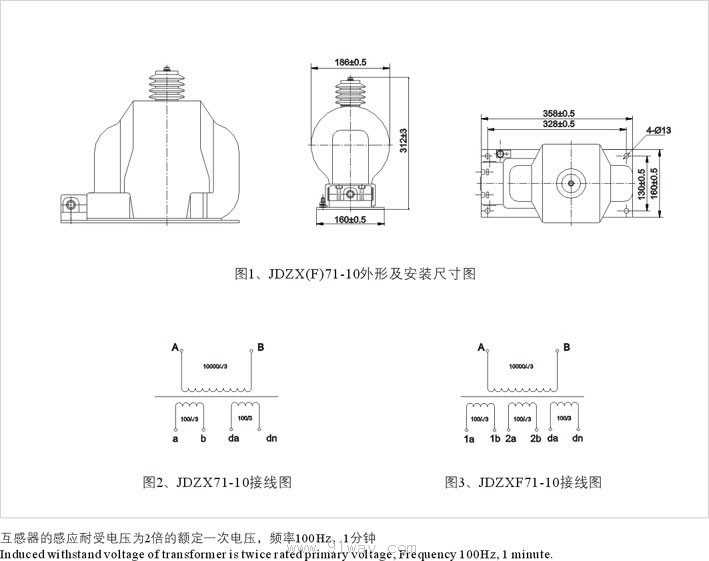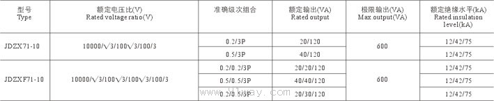 額定一次電壓: 10000/√3V額定二次電壓: 100/√3V額定頻率: 50Hz額定二次輸出及其相應準確級(負荷功率因素為0.8滯后)JDZ(X)(F)71-10系列電壓互感器見表1