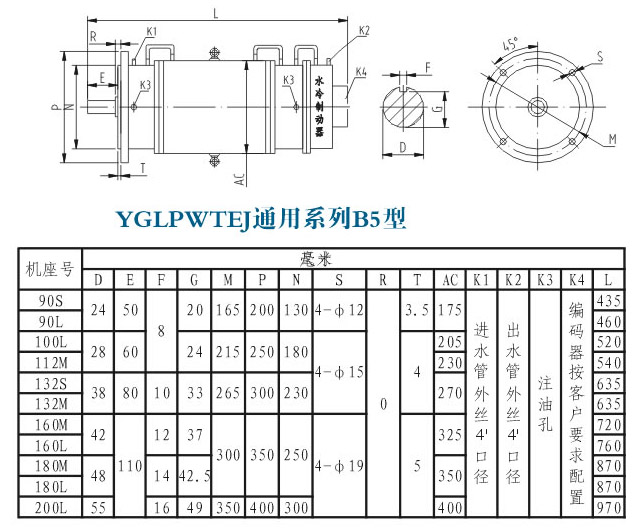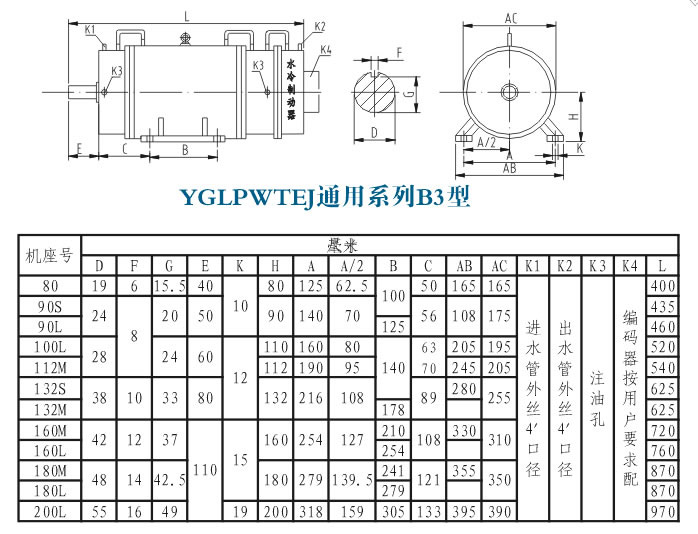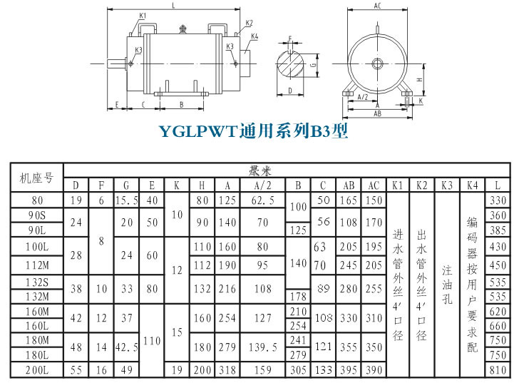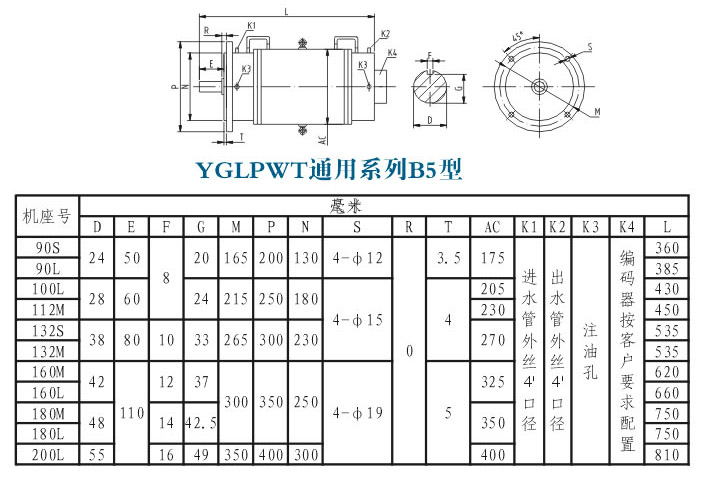 一、概述 YGLPWT、YGLPWTEJ系列水冷耐高溫輥道專用變頻調速電動機是我公司生產水冷電機產品系列中的一種。它具有耐高溫(超高溫)、高濕、防腐、防水、防塵等特點。詳細介紹參見YZLPWT系列。二、YGLPWT電動機型號的意義: 三、技術參數: YGLPWT、YGLPWTEJ系列電動機技術參數 四、基本安裝形式: YGLPWT通用系列B3型 YGLPWT通用系列B5型 YGLPWTEJ通用系列B3型 YGLPWTEJ通用系列B5型
