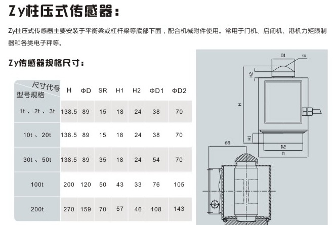ZY型柱壓式傳感器主要安裝于平衡梁或杠桿梁等底部下面,只承受壓力的傳感器。常用于門機、啟閉機、港機力矩限制器和電子秤等場合。型號標注例如“ZY-20t”。ZY柱壓式荷重傳感器