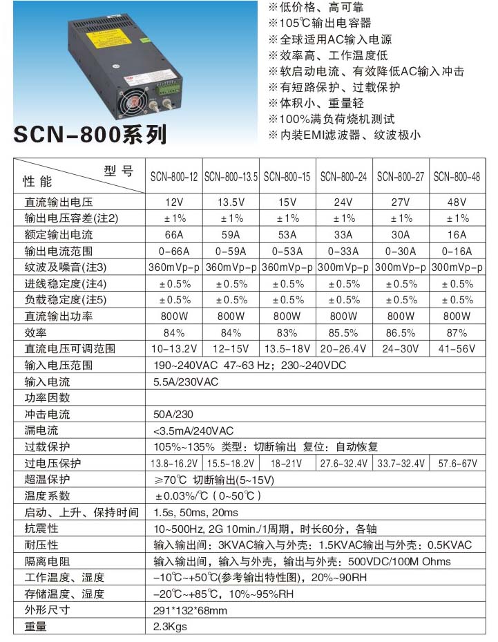 SCN-800系列AC/DC單組電壓輸出開關電源