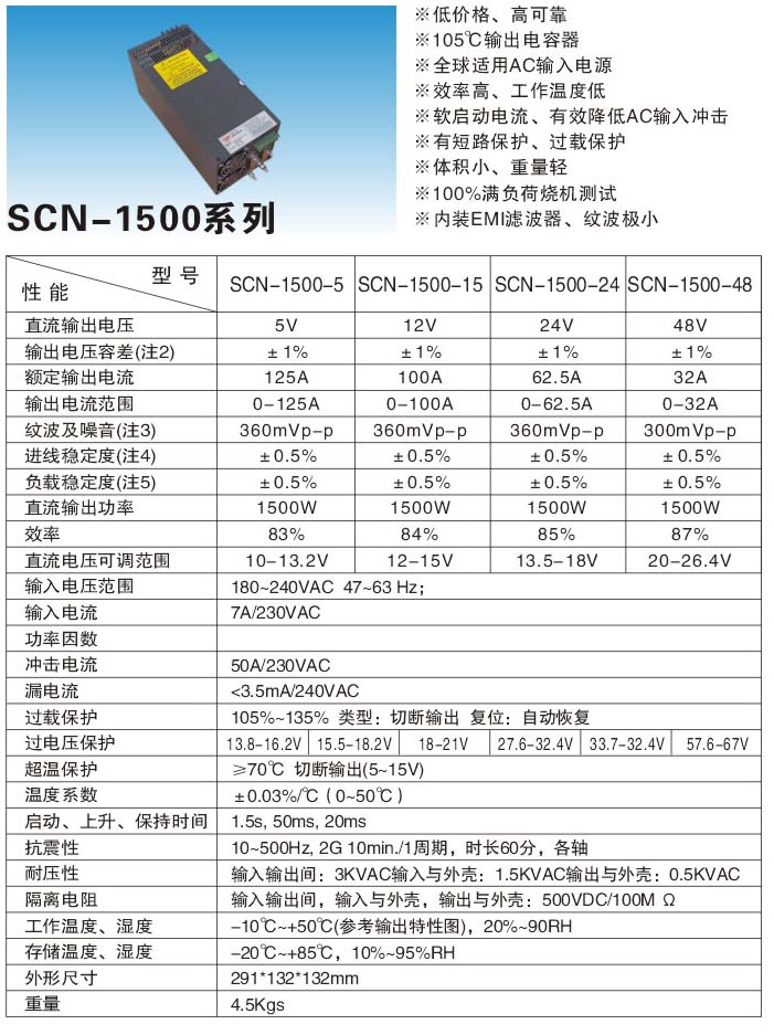 SCN-1500系列AC/DC單組電壓輸出開關電源