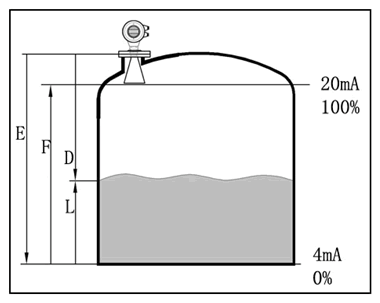 通過輸入空罐高度E(=零點),滿罐高度F(=滿量程)及一些應用參數來設定,應用參數將自動使儀表適應測量環境。對應于4-20mA輸出。