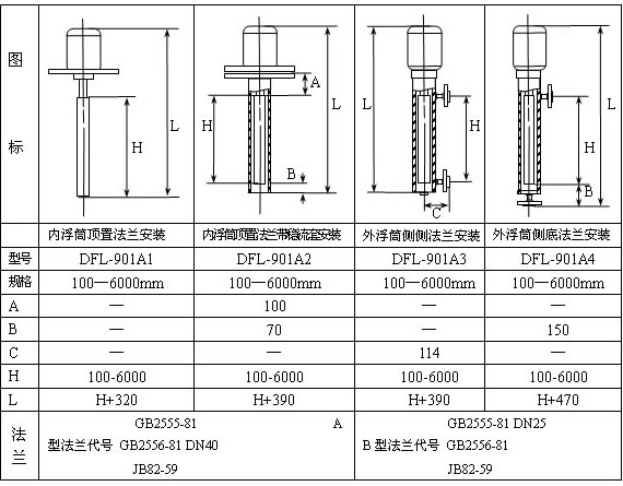 安裝方式:1—為內浮筒頂置法蘭安裝,
