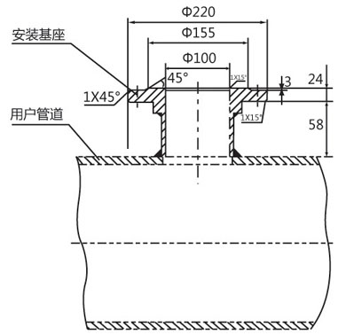 在第一次安裝時(shí),如果被測(cè)管道允許斷流,可按照安裝基座示意圖(圖3),在被測(cè)管道上滿足直管段長(zhǎng)度要求的位置開一個(gè)Φ100孔,完成“安裝基座”與管道的連接。然后按照安裝示意圖(圖2)完成全部安裝工作。也可以安裝球閥后暫時(shí)關(guān)閉球閥,以不影響管道輸送流體,待以后再安裝傳感器。