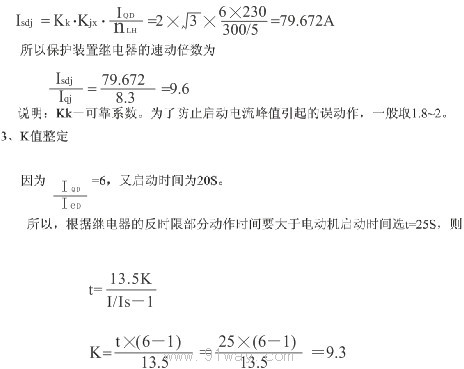 例:已知給水泵電動(dòng)機(jī)的參數(shù)為:額定電壓VeD=6KV,容量PeD=2000kw,額定電流IeD=230A,啟動(dòng)倍數(shù)=6,電流互感器變比LH=300/5,電動(dòng)機(jī)啟動(dòng)時(shí)間為20S。(二相差式接線)