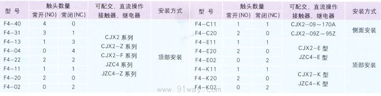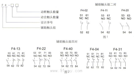 1.適用范圍 F4系列有二極和四極兩種,該輔助觸頭組和交流接觸器或接觸器組合后能擴展輔助觸點的數量。本系列還包括C、E、K型,C型為側裝,其它為頂部安裝。 2.型號及其含義 3.輔助觸頭組規格: