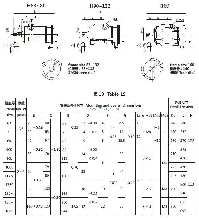 機座無底腳,端蓋無凸緣,機座有3或4根筋,借筋接觸安裝電動機,帶外接接線盒。