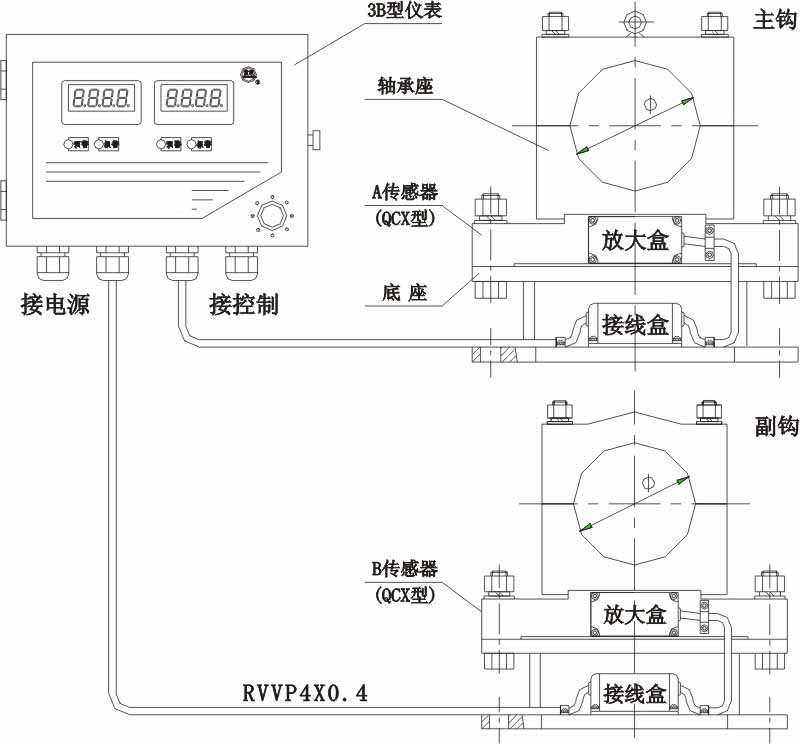 QCX-3B型主要用于主副鉤起重機、閘門啟閉機等雙吊點式的起重機構。它的特點是雙傳感器組合,雙通道輸入,分別顯示、分別控制輸出。傳感器可以采用軸承座式(QCX)、定滑輪式(HLF-3)、軸銷式(ZX)、柱壓式(ZY)等多形式組合。