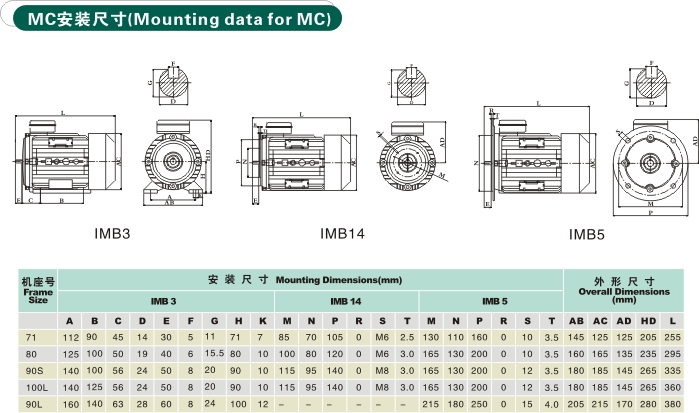 該電動機的安裝尺寸完全符合IEC標準。安裝型號:IM B3、IM B5、IM B35、IM B14、IM BV1、IM BV3、IM BV5、IM Bv6、IM BV18、IM Bv19、