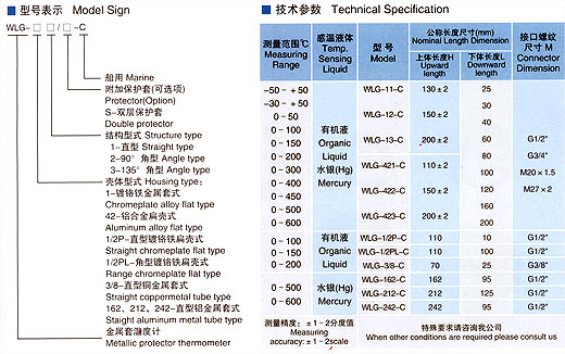 WLG型船用金屬套溫度計 金屬套溫度計由玻璃溫度計和金屬保護管構成,廣泛應用于船舶及工業、農業、科研單位的溫度測量。