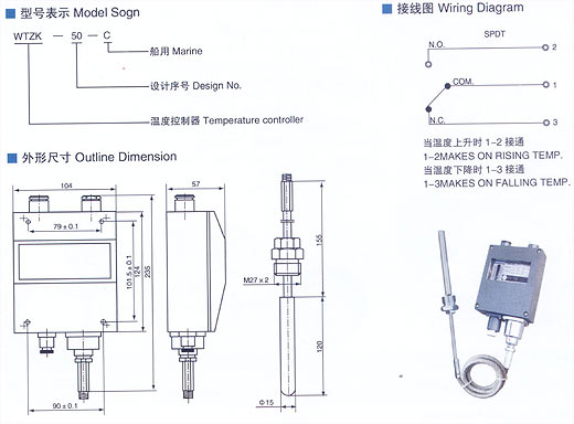 WTZK型溫度控制器是可隨被控介質溫度變化而使電路閉合或斷開的電開關.適用于船舶、冷凍設備或其他工業設備中與執行機構配套,對氣體、液體或蒸汽介質的溫度進行兩位式控制。