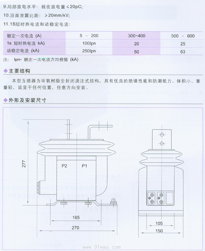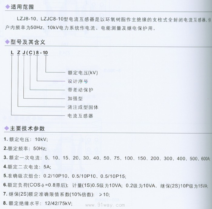 LZJ(C)8-10型電流互感器是以環氧樹脂作主絕緣的支柱式全封閉電流互感器,供戶內頻率為50Hz,10kV電力系統作電流、電能測量及繼電保護用。