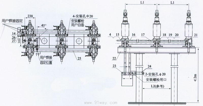 GW5-40.5D(W)/630戶外交流高壓隔離開關外形及安裝尺寸: