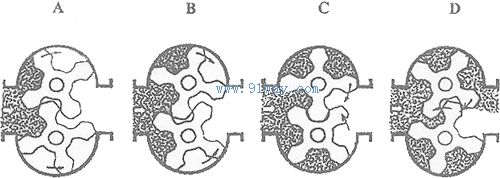 流量計的一對特殊齒型的螺旋轉子直接嚙合,無相對滑動,不需要同步齒輪?窟M、出口處較小的壓差推動轉子旋轉。下圖代表一對轉子運轉時的某一個橫截面。同一時刻,每一個轉子在同一橫截面上受到流體的旋轉力矩雖然不一樣,但兩個轉子分別在所有橫截面上受到旋轉力矩的合力矩是相等的。因此兩個轉子各自作等速、等轉矩旋轉,排量均衡無脈動。螺旋轉子每轉一周可輸出 8 倍空腔的容積,因此,轉子的轉數與流體的累積流量成正比,轉子的轉速與流體的瞬時流量成正比。轉子的轉數通過磁性聯軸器傳到表頭計數器,顯示出流過流量計(流過管道)的流量。