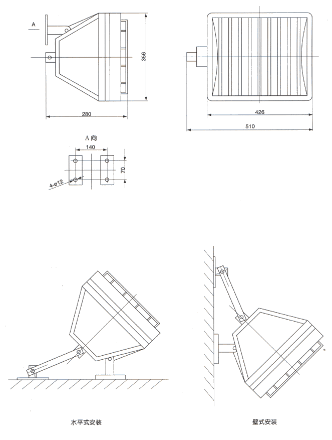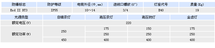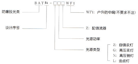 BAT51-IIB系列防爆泛光燈適用范圍: 1、1區、2區危險場所。 2、IIA、IIB類爆炸性氣體環境。 3、可配裝汞燈、高壓鈉燈、金鹵燈。 產品特點: 1、鑄鋁合金外殼,表面噴塑。 2、燈體可在水平安裝或壁式安裝,仰角在45度至-90度內可調。 3、采用桔紋漫反射板,使光線柔和且照射角大。 4、電纜布線。 BAT51-IIB系列防爆泛光燈型號意義: BAT51-IIB系列防爆泛光燈技術參數: