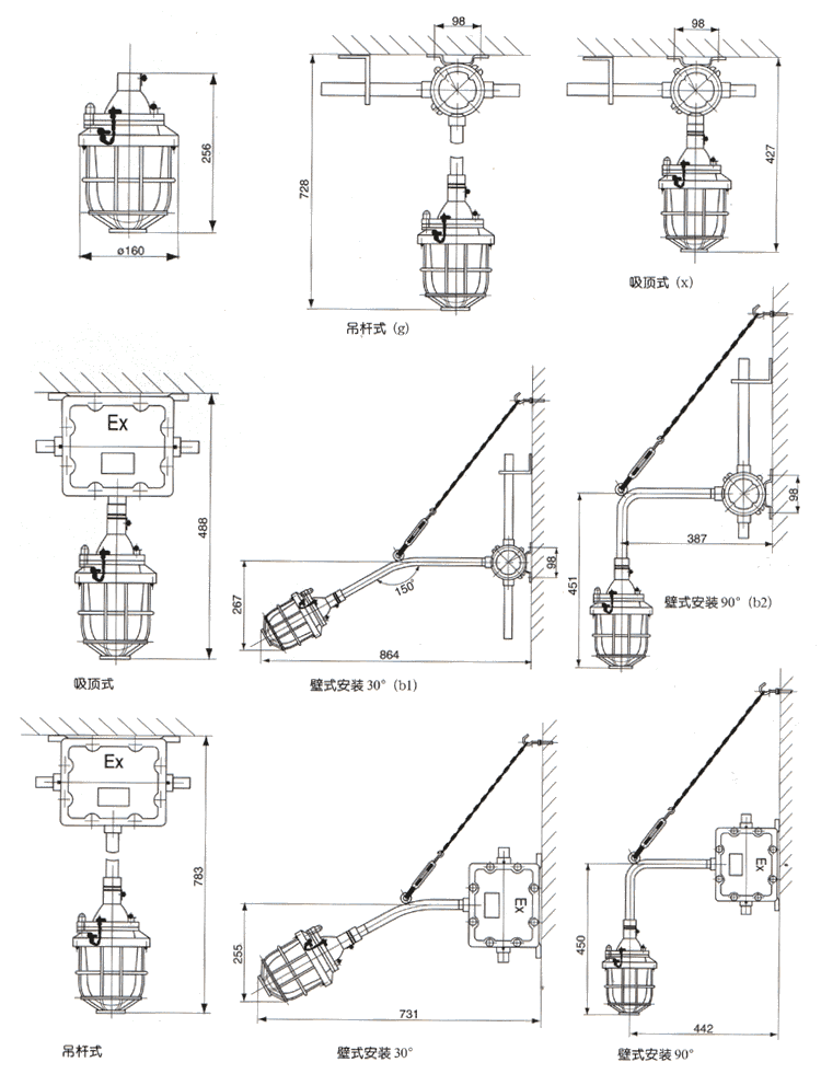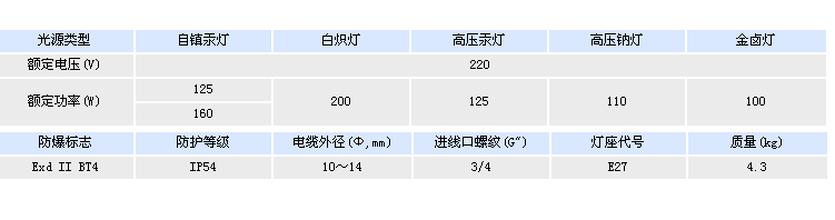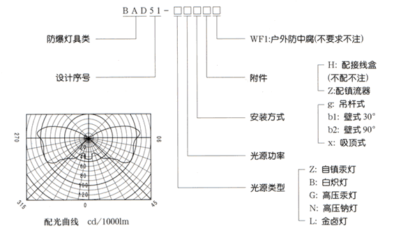 BAD51-系列隔爆型防爆燈(IIB) (下開蓋)適用范圍: 1、1區、2區危險場所。 2、IIA、IIB、類爆炸性氣體環境。 3、可配裝白熾燈,汞燈,高壓鈉燈,金鹵燈。 4、可按用戶要求配裝燈傘。 產品特點: 產品特點: 1、鑄鋁合金外殼,表面噴塑。 2、壓鑄成型,結構緊溱,外形美觀。 3、采用活節螺栓緊固,能快速開啟,便于維修。 4、鋼管布線。 型號意義: 主要技術參數: