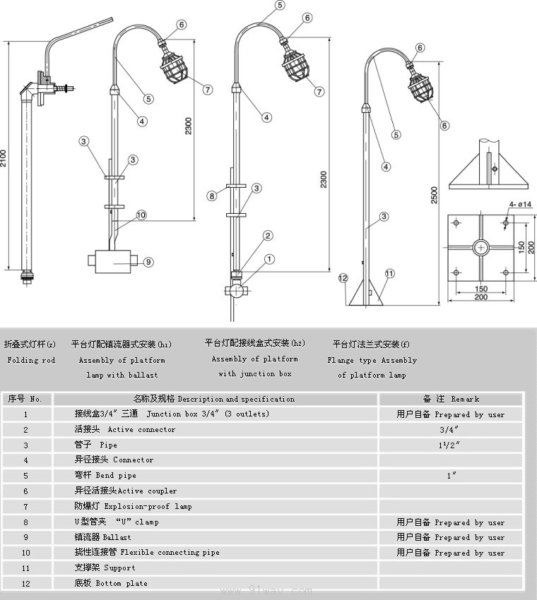 BT52-系列防爆平臺燈(ⅡB、ⅡC、e)適用范圍: 適用范圍同相應的配裝燈具。 產品特點: 1、燈桿采用優質鋼管表面噴塑。 2、彎桿和直桿采用插接式連接,便于安裝和調整燈具的轉向。 3、01、02、05、06、07、08型可根據用戶要求配裝燈傘。 BT52-系列防爆平臺燈(ⅡB、ⅡC、e)型號意義: BT52-系列防爆平臺燈(ⅡB、ⅡC、e)主要技術參數: