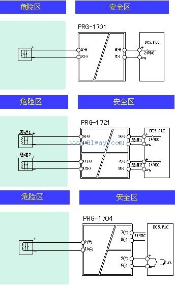 PRG-1701/1721/1704開關(guān)量輸出隔離安全柵開關(guān)量輸出隔離式安全柵,安全場所一側(cè)的觸點(diǎn)開關(guān)信號(hào)通過安全柵控制或驅(qū)動(dòng)現(xiàn)場本安設(shè)備工作,本安設(shè)備如電磁閥、聲光報(bào)警器等。PRG-1701,PRG-1721輸入輸出隔離性能允許控制開關(guān)直接連到24VDC供電回路的任一側(cè)。