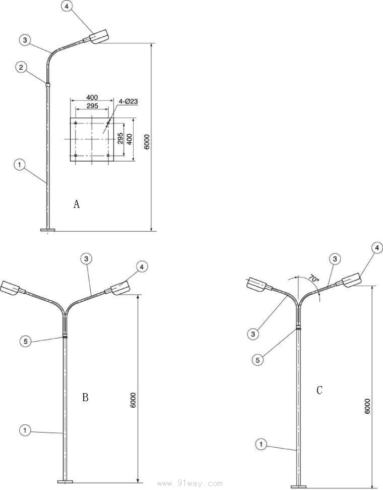 2、燈桿采用鍍鋅鋼管,表面噴塑,具有較好的防腐能力,彎桿和直桿采用插接