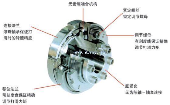 當設備驅動機械過載或傳遞力矩超過設定的打滑力矩時,鋼球離開支撐法蘭的凹槽,扭力限制器脫開,使主動部件和從動部件之間打滑,此是傳遞的力矩降低到最小,同時發訊環產生軸向位移,觸動限位開關,并通過線路輸出信號,切斷電動機電源,設備停止運轉,起到保護設備的作用。