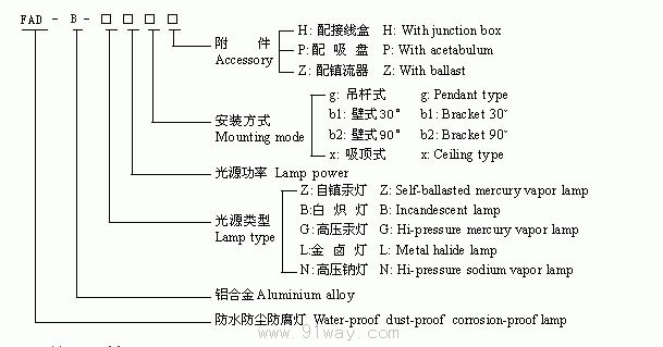 FAD-B系列防水防塵防腐燈型號意義: