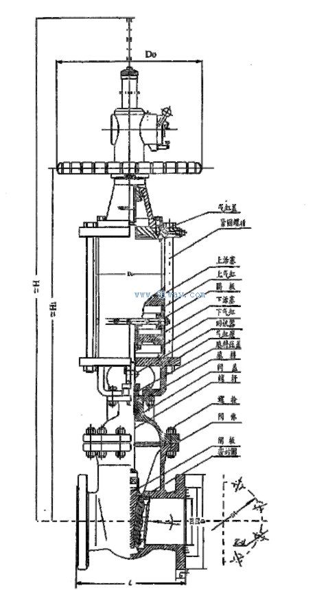 1、本閥主要由閥體、閥蓋、閘板、閥桿、密封圈、雙層氣缸及其活塞、活塞桿、隔板連同緩沖機(jī)構(gòu)、手動機(jī)構(gòu)、氣動—手動轉(zhuǎn)換裝置和閥蓋填料箱裝置等部分組成。