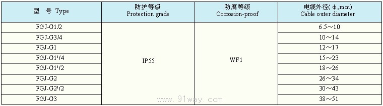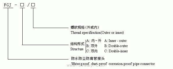 FGJ系列防水防塵防腐管接頭適用范圍: 1、環境溫度-25°至55°。 2、強酸、強堿、鹽、氨、氯離子腐蝕,多水、多塵、潮濕等環境。 3、廣泛應用于石油、化工、倉庫、食品、制藥、軍工等工廠企業配線配管。 產品特點: 1、優質材料、鑄鋼制造。 2、螺紋規格可特制,如NPT螺紋等。 FGJ系列防水防塵防腐管接頭型號意義: FGJ系列防水防塵防腐管接頭