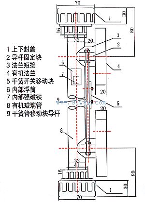 液位計通體透明、美觀大方。上有清洗封蓋、下有放空封蓋和透明連接法蘭、透明液位標尺、紅色磁浮筒、可移動干簧開關、開關導桿等組成。