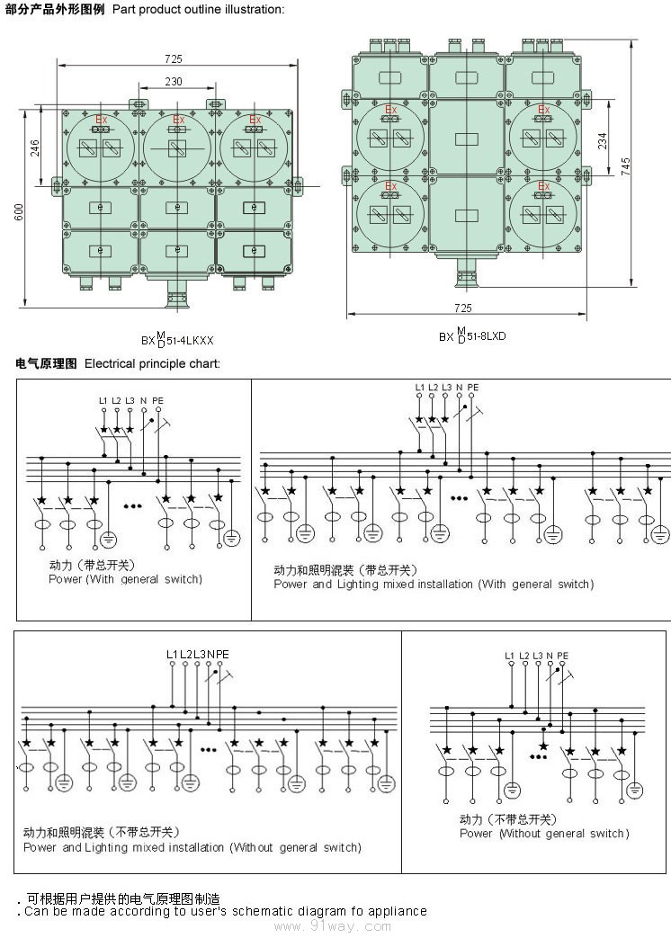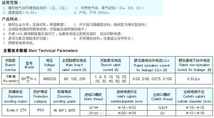 型號意義: 主要技術(shù)參數(shù): BXM(D)51-L防爆(照明/動力)配電箱(帶漏電保護)(ⅡB、ⅡC)