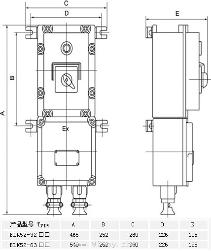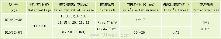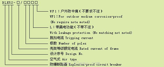 BLK52系列防爆斷路器(Ⅱ B、Ⅱ C)適用范圍: 1、1區(qū)、2區(qū)危險場所。 2、ⅡA、ⅡB、ⅡC類爆炸性氣體環(huán)境。 *要求ⅡC類請注明。 產(chǎn)品特點: 1、鑄鋁合金外殼,表面噴塑。 2、內(nèi)裝高分斷小型斷路器。 3、具有過載、短路保護功能、也可根據(jù)要求加裝漏電等附件。 4、鋼管或電纜布線均可。 BLK52系列防爆斷路器(Ⅱ B、Ⅱ C)型號意義: 主要技術(shù)參數(shù):