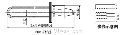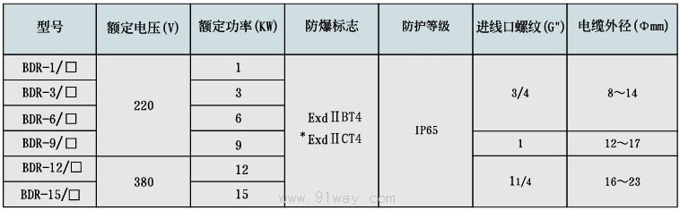 BDR系列防爆電加熱器(ⅡB)適用范圍: 1.1區(qū)、2區(qū)危險氣體場所; 2.ⅡA、ⅡB、類T1~T4組爆炸性氣體或蒸氣環(huán)境; 3.可作為水箱,油箱,反應(yīng)塔,罐等容器中的液體或氣體加熱; 產(chǎn)品特點(diǎn): 1.鋁合金殼體表面噴塑; 2.電加熱管外殼為不銹鋼,內(nèi)部采用耐高溫絕緣膠壓力注射定型電熱體,外套采用鋁合金; 3.法蘭式安裝,特殊要求可定制。 型號意義: 主要技術(shù)參數(shù):
