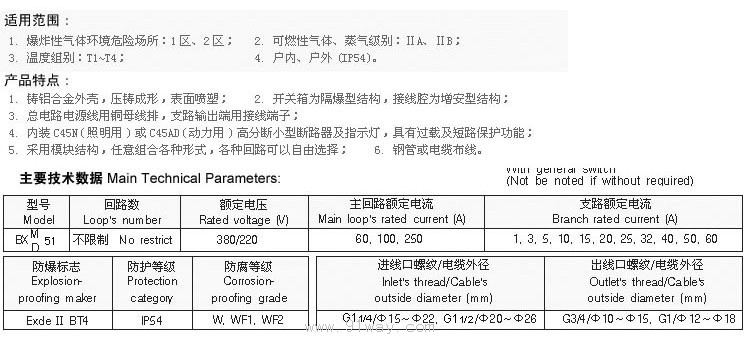 BXM(D)51系列防爆照明(動力)配電箱(ⅡB)主要技術參數:  BXM(D)51系列防爆照明(動力)配電箱(ⅡB)技術參數