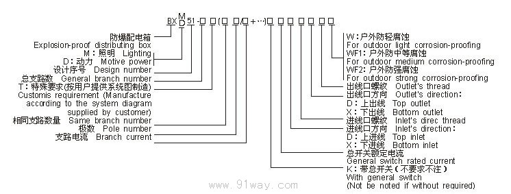 BXM(D)51系列防爆照明(動力)配電箱(ⅡB)型號意義:  BXM(D)51系列防爆照明(動力)配電箱(ⅡB)選型說明