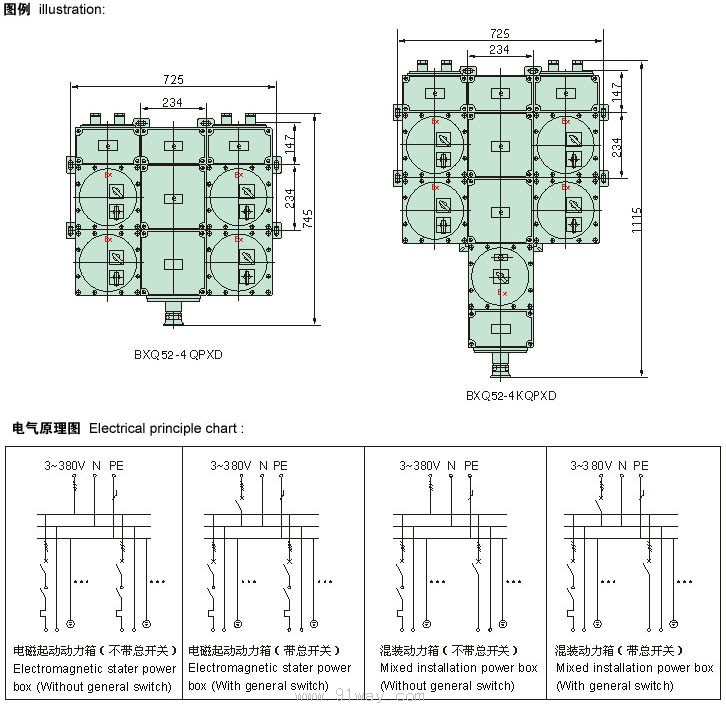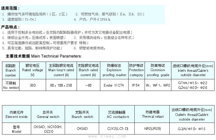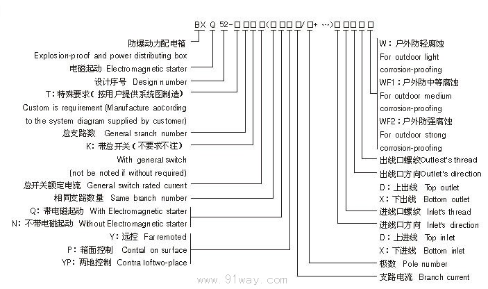 BXQ52防爆動力配電箱(電磁起動)(ⅡB、ⅡC)型號意義: 主要技術參數: BXQ52防爆動力配電箱(電磁起動)(ⅡB、ⅡC)